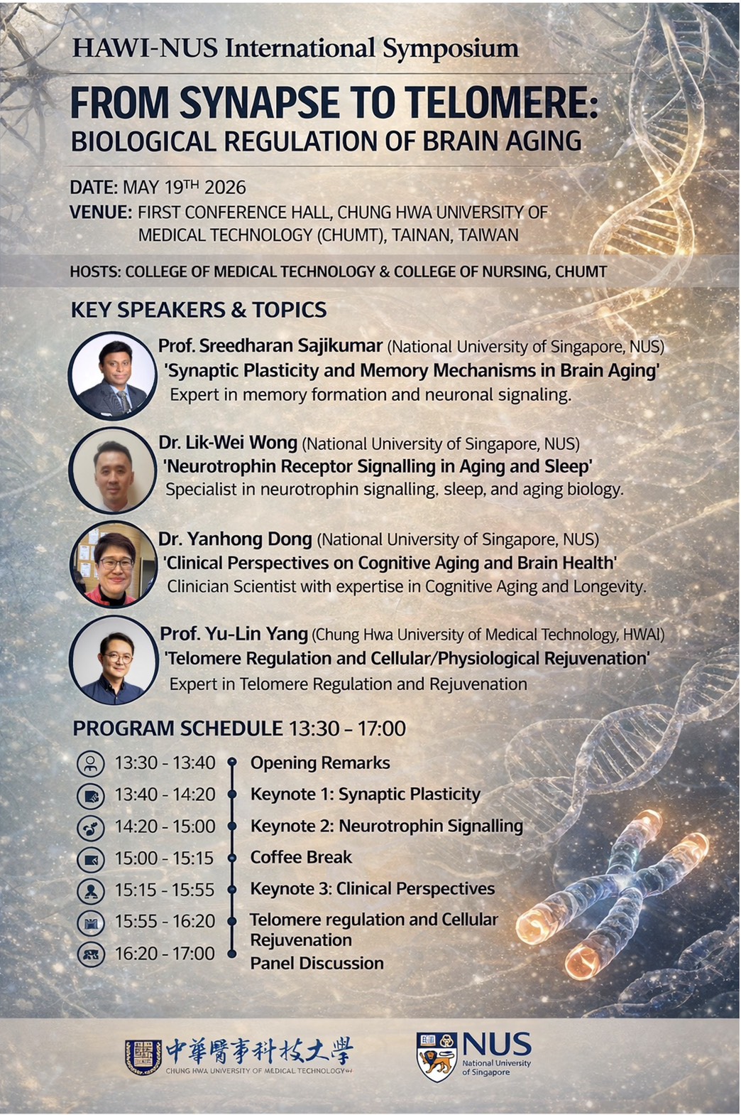 | 主 | 旨: | 全世界大學QS排名亞洲連續兩年排名第一的新加坡國立大學(NUS)Prof. Sreedharan等三位教授受中華醫大邀請針對「神經科學、失智認知與與端粒調節」等抗老議題進行國際演講,敬請轉知相關系所教授與學生踴躍參與,並學研機構與團隊開展可能的雙邊深度合作。 | |||||