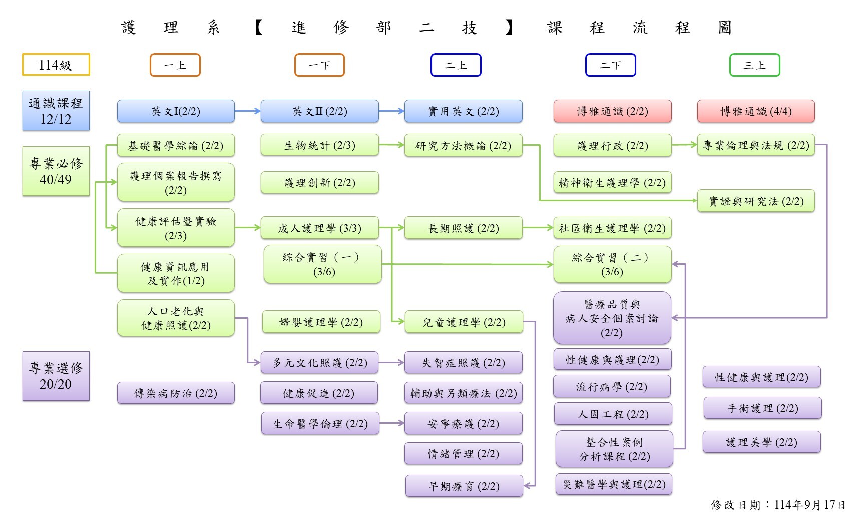 進修部的課程以提升在職學生專業能力為目標,專業必修課程重視實務課程,如配合臨床進階所需的課程「護理個案報告撰寫」;因應人口老化及長照2.0政策的課程「人口老化與健康照護」、「長期照護」。在實習課程方面規劃兩階段實習,並訂定實習課程抵免學分辦法,學生抵免部分實習課程,獲實習課程抵免之同學需修習「整合性案例分析」課程,於課程中學習臨床案例研討,護理推論與決策過程。選修課程部分則開設多元文化照護、護理創新、早期療育、醫療品質與病人安全個案討論等課程供學生適性選課。