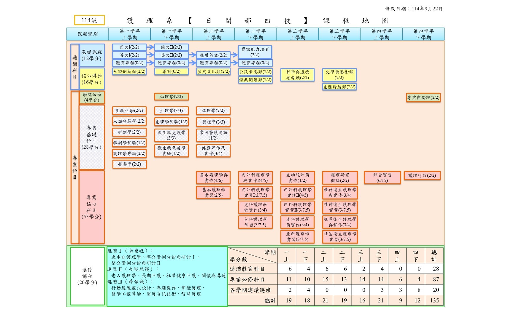 依教育目標及培育學生核心能力為基礎,課程類別分為通識課程(含語文課程)、專業基礎課程、專業核心課程及專業選修課程。語文能力為專業能力發展之基礎,故安排於一年級中學習,為提升其專業英文能力,開設實用英文課程,加強熟悉醫護術語與專業英語會話。
