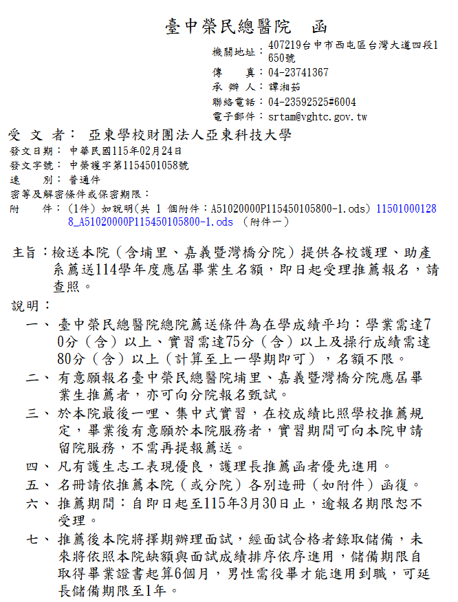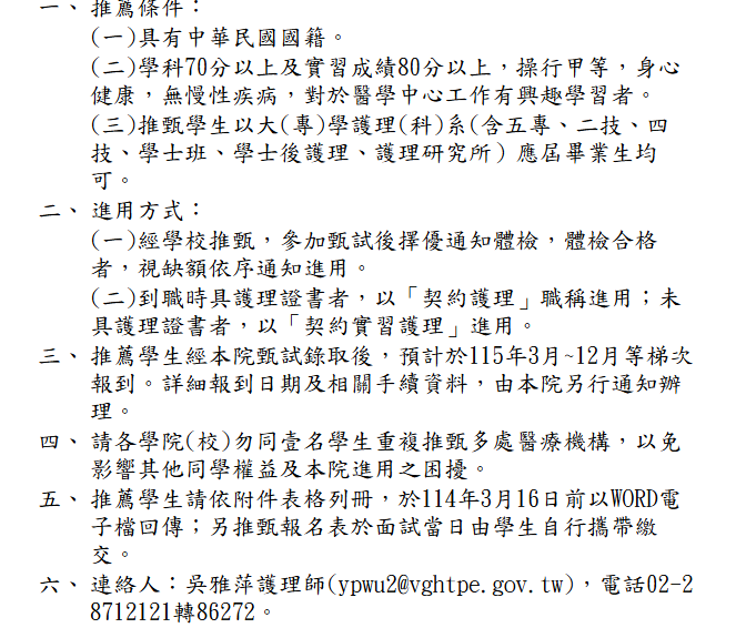 | 22 | 臺北榮民總醫院桃園分院 | 公文內容 | 申請表可至系辦領取 | ||||||||